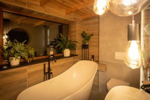 Komfortowa łazienka apartamentu została wyposażona w dużą wannę, gdzie goście mogą się zrelaksować i odprężyć po dniu pełnym przygód. Panoramiczne okno z widokiem na las dodaje uroku i tworzy wyjątkową atmosferę.